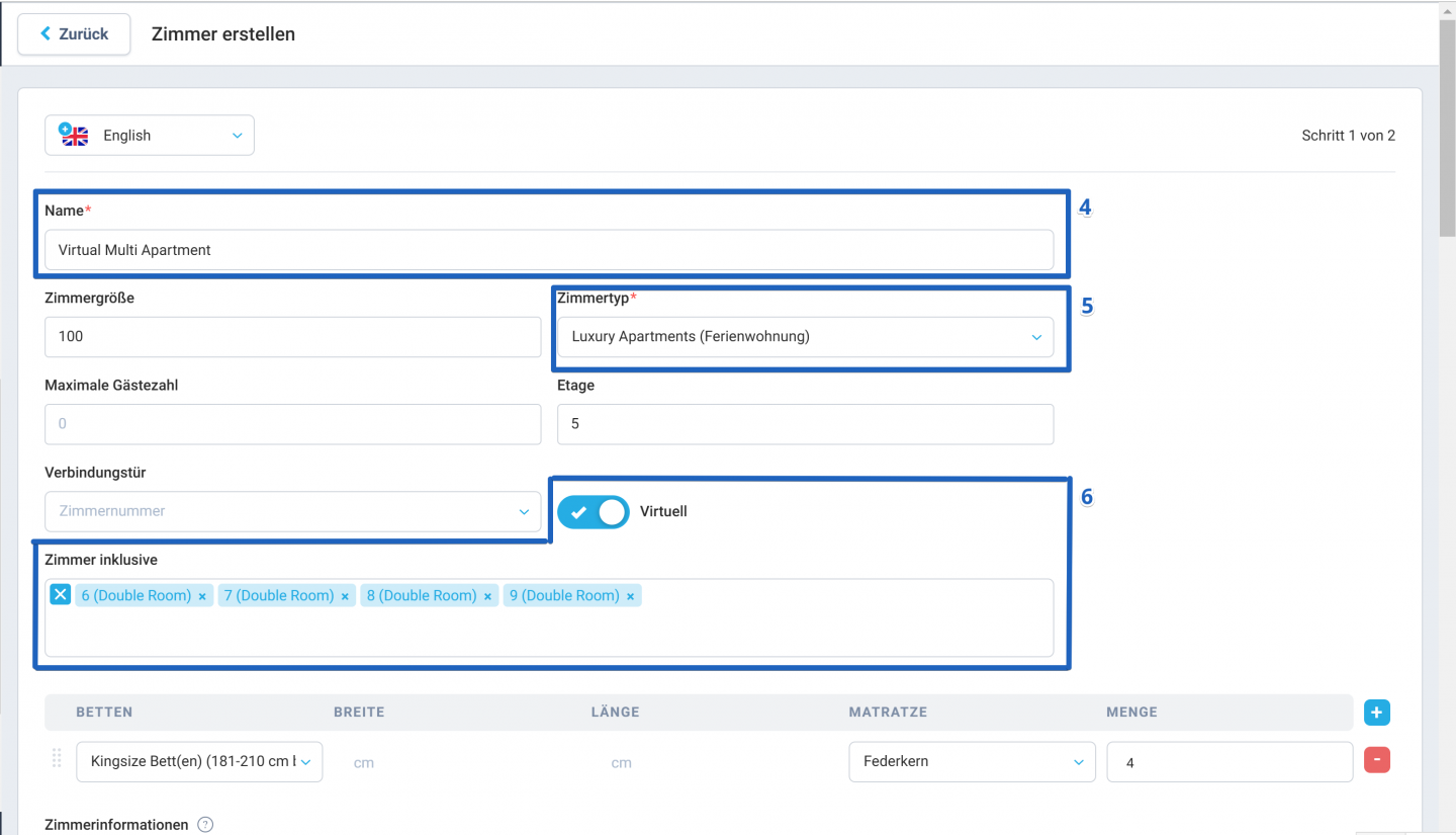 - Aktivieren Sie den Schalter für Virtuell und wählen Sie die einzubeziehenden Zimmer aus. Hier wählen Sie die Zimmer aus, die Sie in Ihr „Virtual Multi-Apartment“ integrieren möchten.